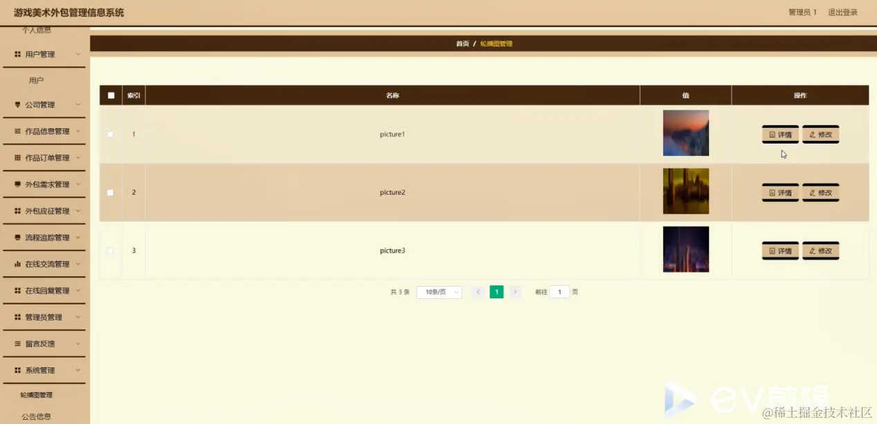 系统管理;在轮播图管理页面中可以对索引,名称,值等内容进行详情和修改操作,还可以对公告信息进行操作,如图5-14所示。