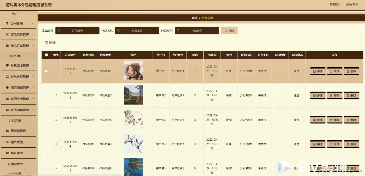 作品订单管理;在作品订单管理页面中可以对索引,订单编号,作品名称,作品类型,图片,用户名,用户姓名,价格,下单时间,账号,公司名称,是否支付,审核回复,审核状态等内容进行详情,修改和删除操作;如图5-10所示。