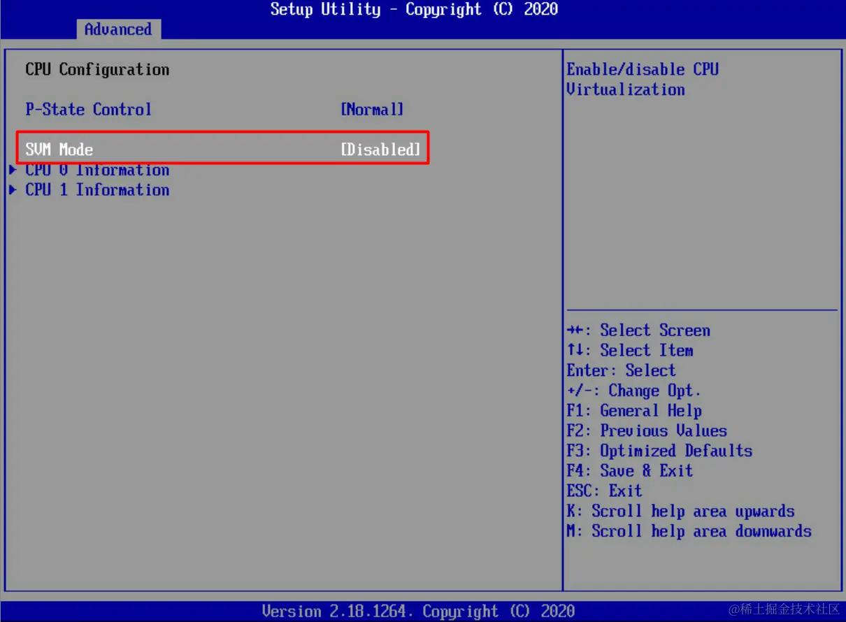 (默认Enable,Advanced-> CPU Configuration->SVM Mode)