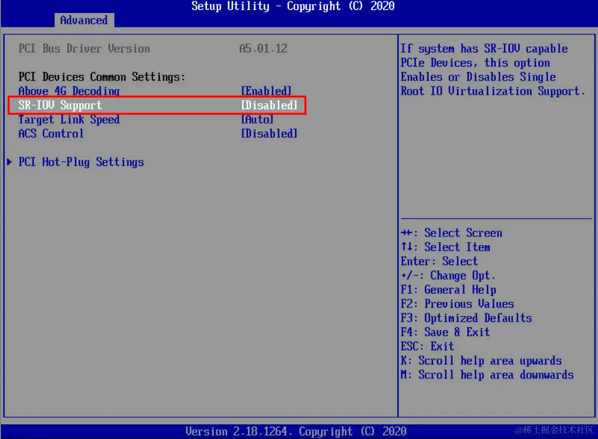 (默认Enable,Advanced-> PCI Bus Driver Version->SR-IOV Support)