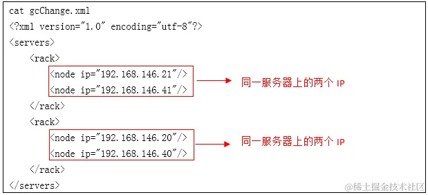 编辑gcChangeInfo_vcall.xml文件时要使同一服务器的每个ip的分片都备份到其他服务器上。如果使用pattern 1创建distribution,需要将同一服务器的ip放到一个rack上,使其备分片全部落到相邻rack上,保证备份片和主分片落在不同的服务器上;如果使用pattern 2创建distribution,因为该模式是将备分片放到相邻的IP上,所以需要将不同服务器的IP在gcChangeInfo_vcall.xml中相邻排放。