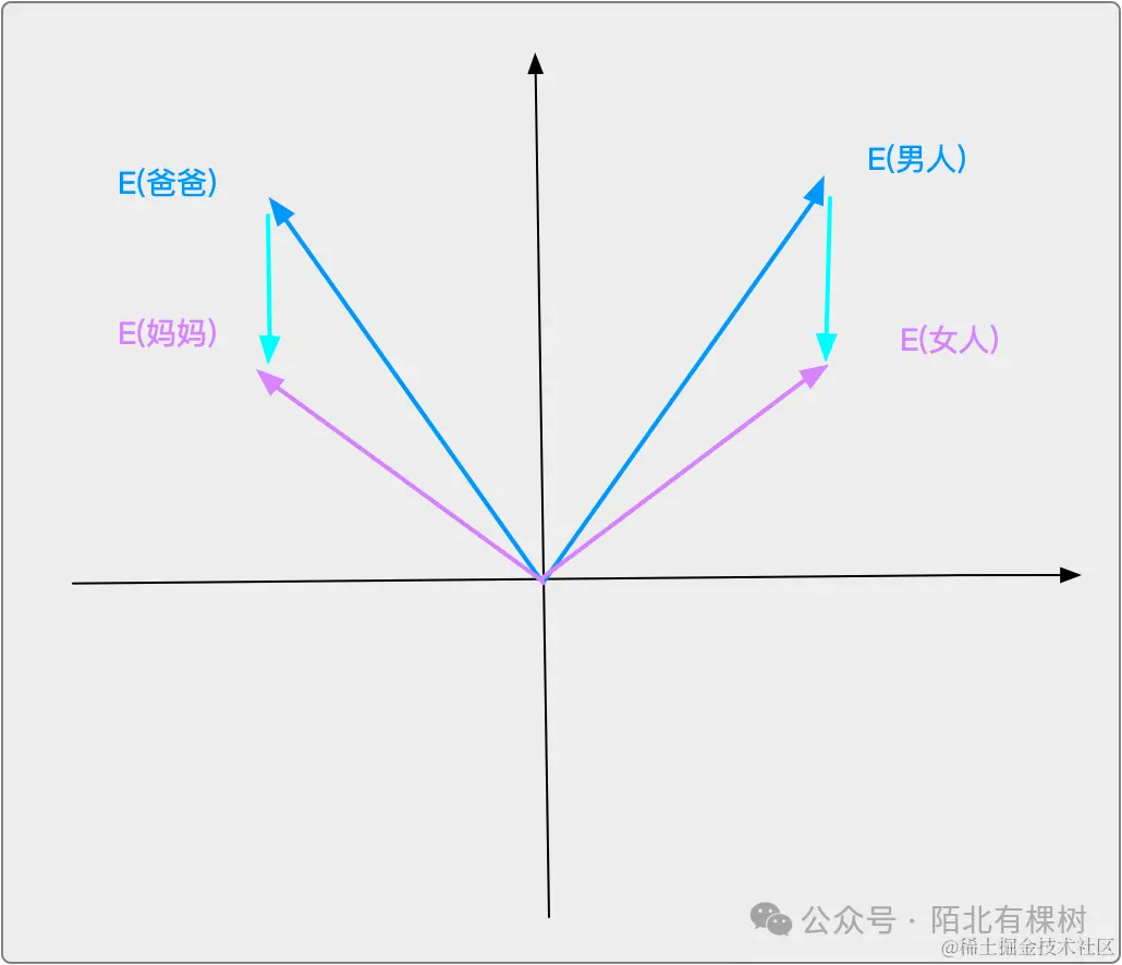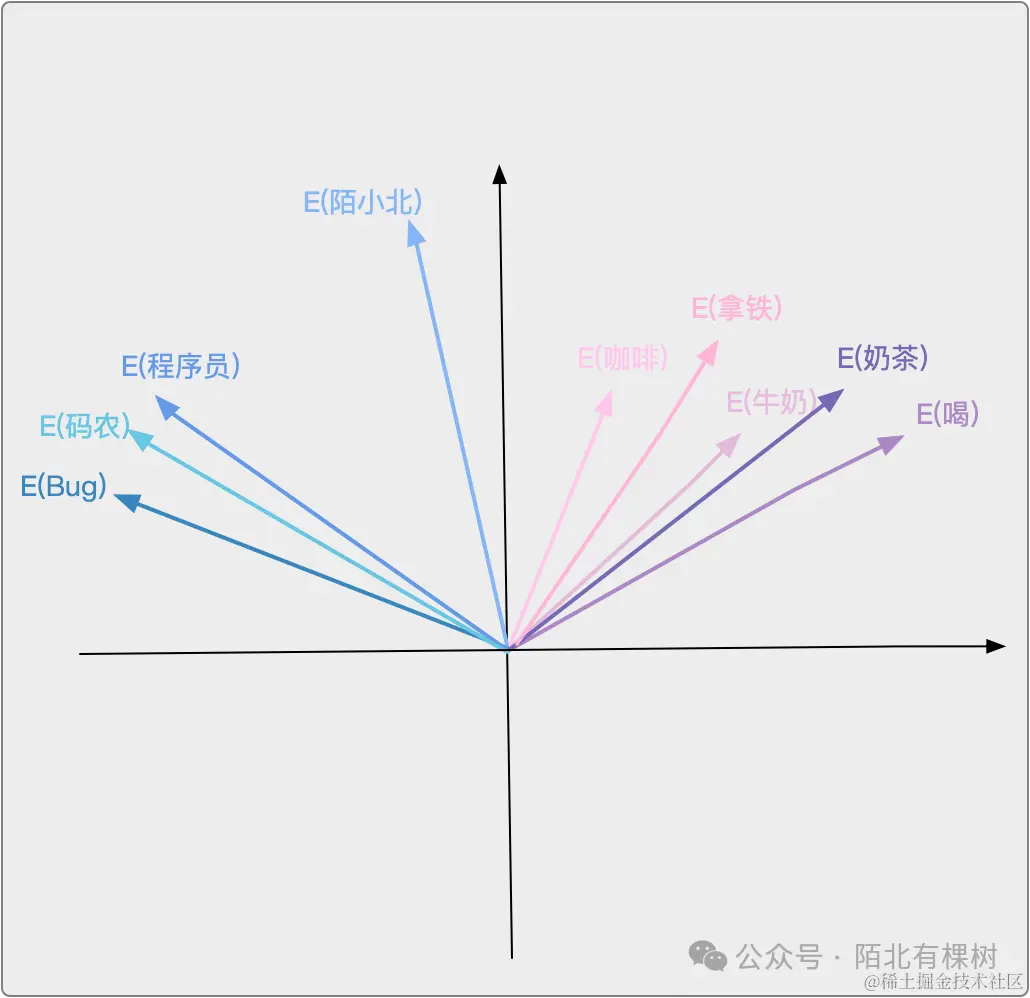 我们用一个更直观的例子来说明词向量,来说明为什么它在NLP领域如此重要。首先,我们假设向量空间是二维的,尽管这种简化与实际情况不符(例如GPT-3中的向量维度是12288),但这样更便于我们直接观察。