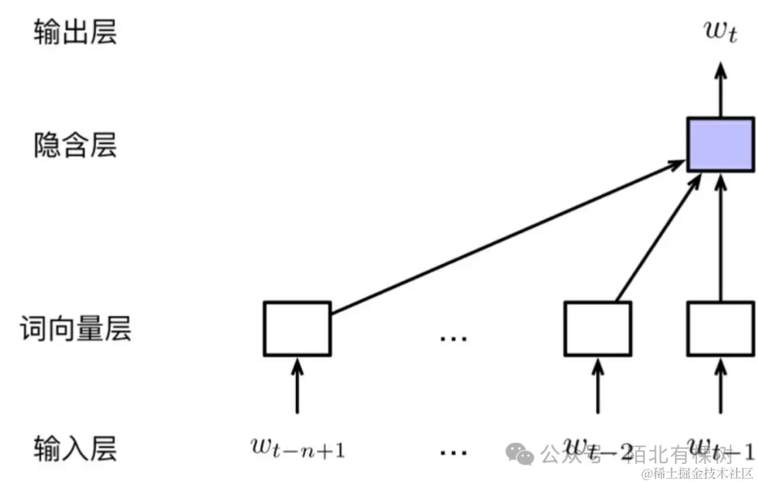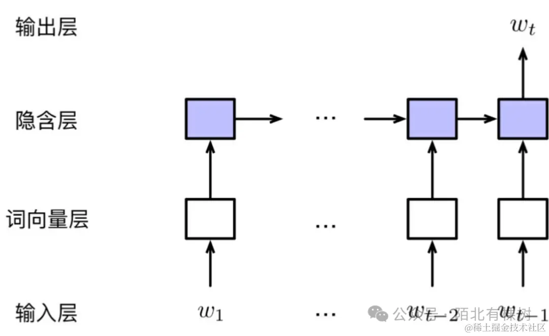 从原理来说,神经网络语言模型沿用了马尔可夫假设,即下一个时刻的词只与过去n-1个词相关,其目标可以表示为输入历史词,输出词𝑤𝑖在词表上的概率分布。前馈神经网络语言模型一个明显的问题是,对下一个词的预测需要回看多长的历史是由超参数N决定的,这个N是固定的。这样处理最大的一个问题是:现实情况下,不同的词语对历史长度N的期望往往是变化的。