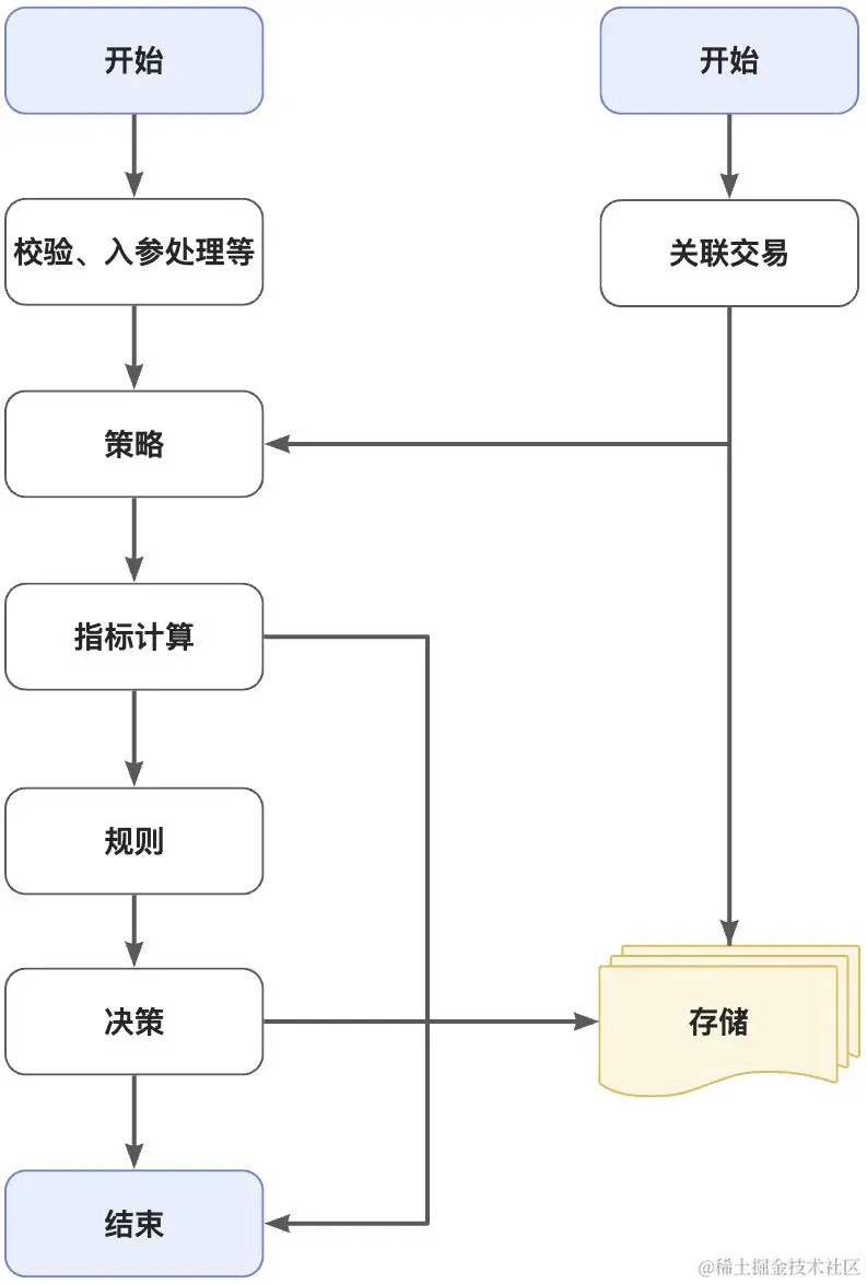 如图,第一个开始表示分为不同交易时的通用流程,所有交易都需要校验、入参处理、策略、规则、决策流程,也是因此,事中是需要指标计算和决策等完整流程的,但是作为结果虽然不需要决策,但是还是要进行指标计算的;第二个开始表示同笔交易时,结果通知,事中还是保留所有完整流程,但是结果已经简化了流程,加入了关联事中交易、减去了决策流程。