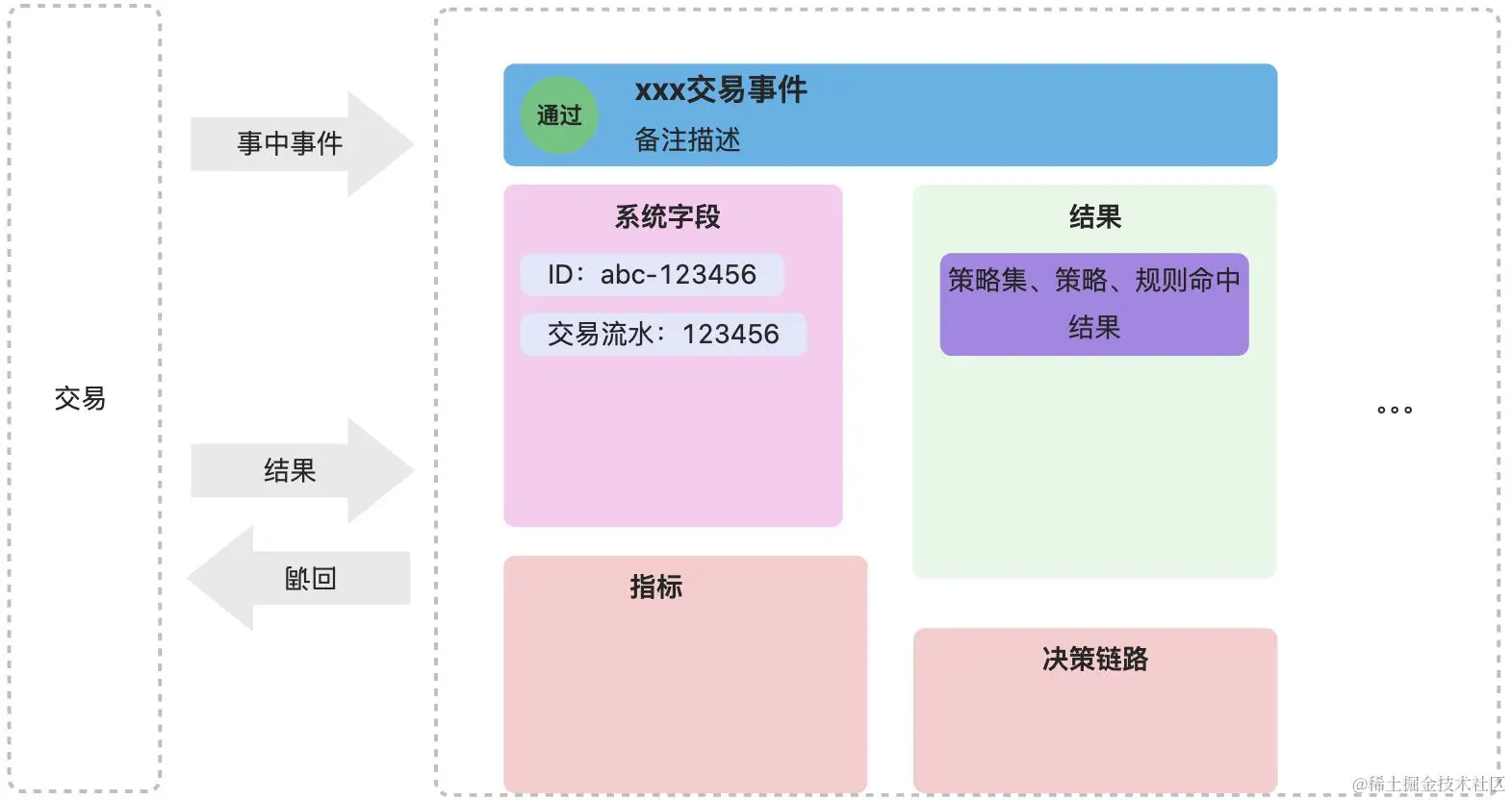 从前面交易接入风控来看,其实一笔交易是有割裂的,交易接入风控后,拿到了决策结果后执行后续流程,在后续流程中又需要接入风控,用于给予风控决策结果的结果和交易结果。什么意思呢?