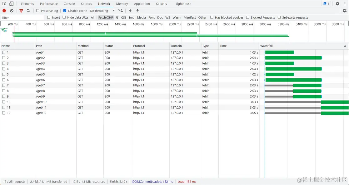 查看Time和Waterfall列显示,这是请求并发限制的模型。