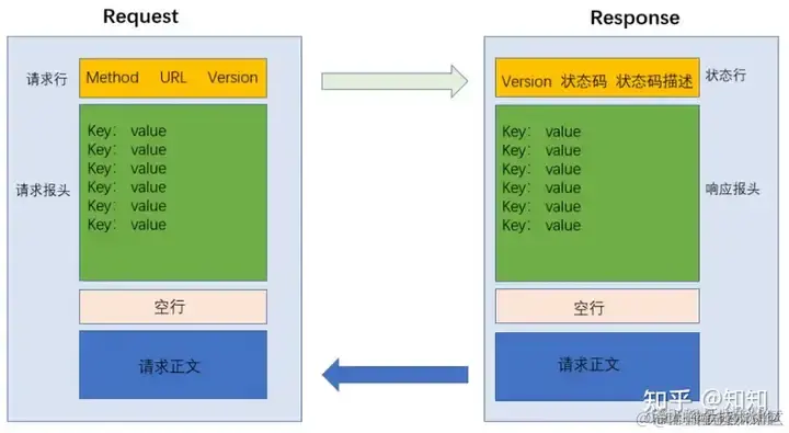 - 服务器接收并处理请求,并返回响应数据,包含状态码、响应头和响应体。