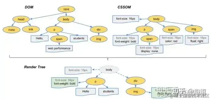 当我们生成 DOM 树和 CSSOM 树以后,就需要将这两棵树组合为 渲染树。 (以下图片出自参考来源)