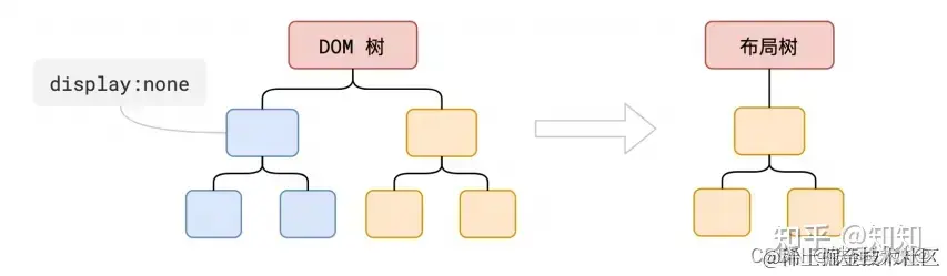 在这一过程中,不是简单的将两者合并就行了。渲染树只会包括需要显示的节点和这些节点的样式信息,如果某个节点是display: none的,那么就不会在渲染树中显示。