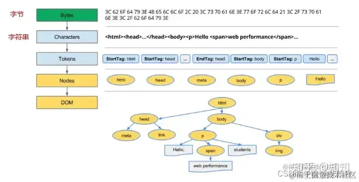 浏览器从磁盘或网络读取HTML的原始字节,并根据文件的指定编码(例如UTF-8)将它们转换成字符串。