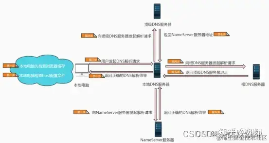 如果之前的过程无法解析时,操作系统会把这个域名发送给这个本地DNS服务器。每个完整的内网通常都会配置本地DNS服务器,例如用户是在学校或工作单位接入互联网,那么用户的本地DNS服务器肯定在学校或工作单位里面。它们一般都会缓存域名解析结果,当然缓存时间是受到域名的失效时间控制的。大约80%的域名解析到这里就结束了,后续的DNS迭代和递归也是由本地DNS服务器负责。
