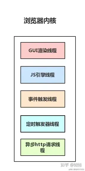 定时器触发线程:主要控制 setInterval和 setTimeout,用来计时,计时完毕后,则把定时器的处理函数推进事件队列中,等待 JS 引擎线程。