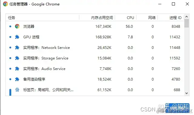 下图以 chrome浏览器 为例。我们可以自己通过Chrome的更多工具 =》 任务管理器 自行验证查看,可以看到chrome的任务管理器中有多个进程(分别是每一个Tab页面有一个独立的进程,以及一个主进程) 然后能看到每个进程的内存资源信息以及cpu占有率。