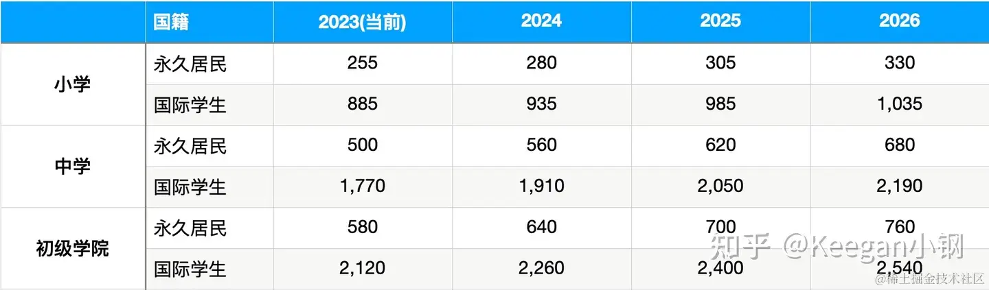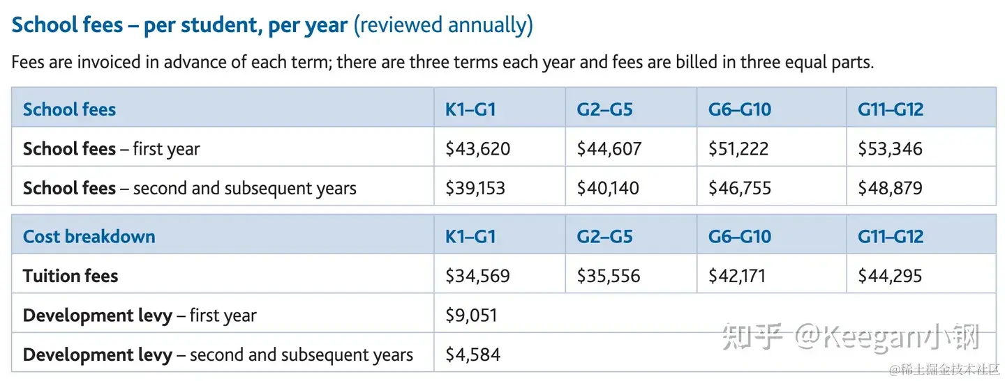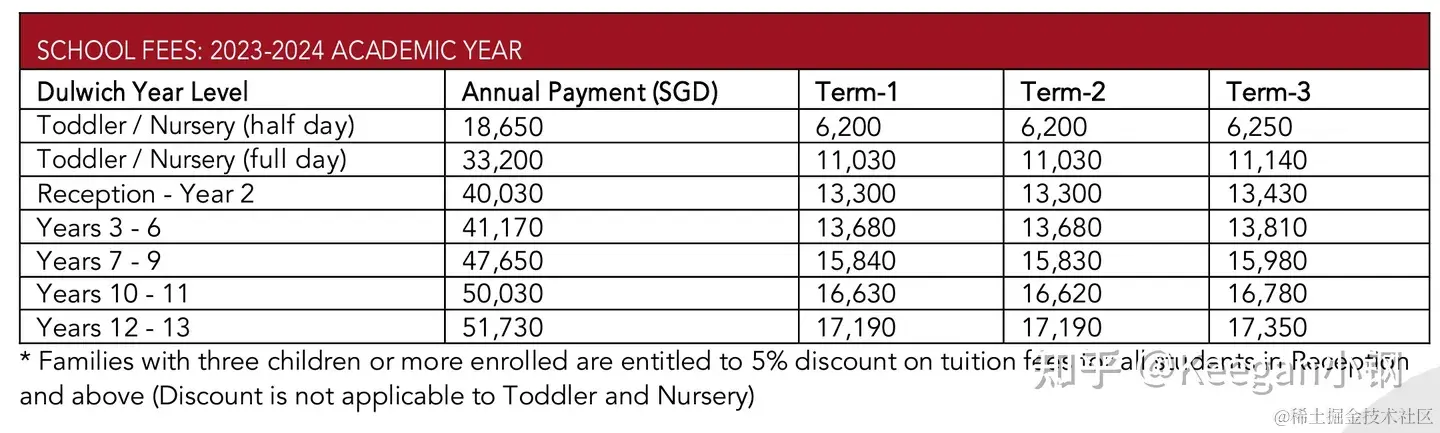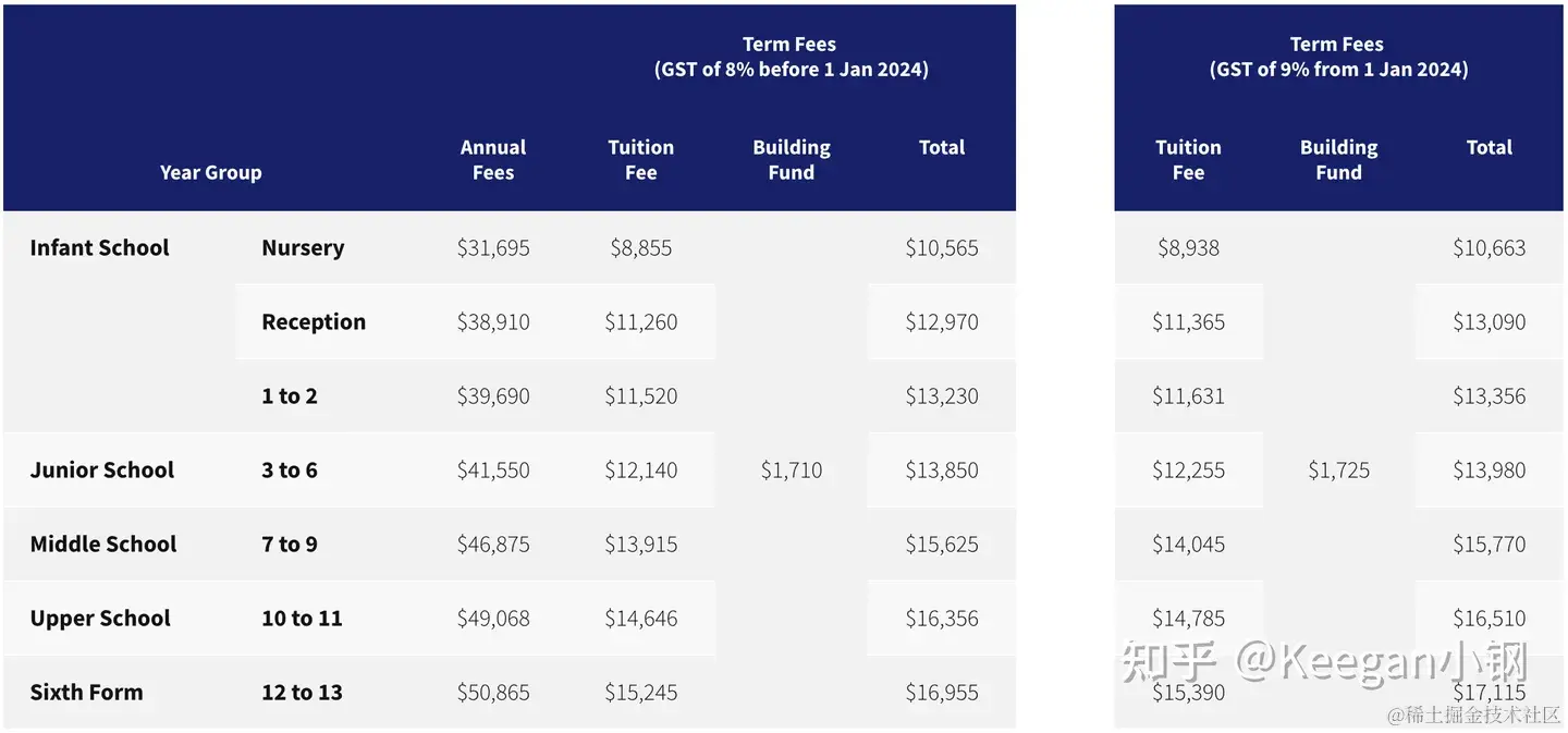 费用方面,以 2023-2024 年度的为例,申请费 1000 新币,注册费 3500 新币,还有个资本税 4500 新币。申请费需在提交入学申请时就支付的,而且不管有没有被录取都是不给退款的。注册费和资本税则是录取后支付,也是不可退的。下表则是这学年各年级的学费: