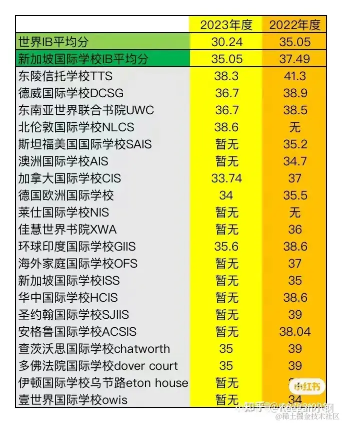 下表列出了 2023 和 2022 年度新加坡各国际学校的 IB 平均分: