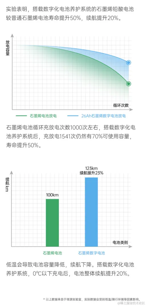 根据绿源的测试,通过模拟夏天阳光直射充电环境,数字化电池在充电过程中最高温度仅为47℃,相较于普通电池的63.9℃,温度降低了约18℃。而在低温环境中,它的性能也不像传统电池一样容易衰减。