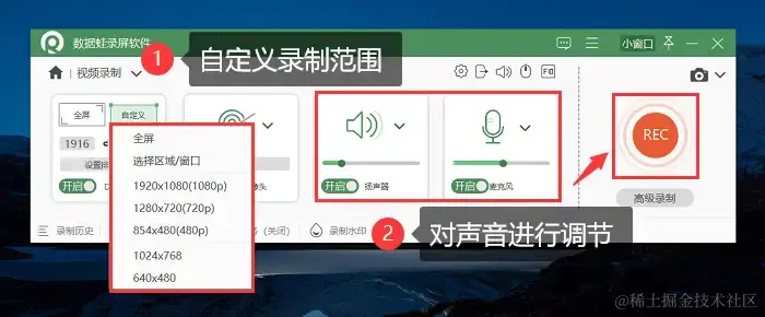 步骤3:在 【视频录制】 界面,可以选择全屏录制或者区域录制,同时需要您对扬声器、麦克风等进行调节,确保您录制的视频有声音。调节完成后您就可以点击 【REC】 进行录制了。