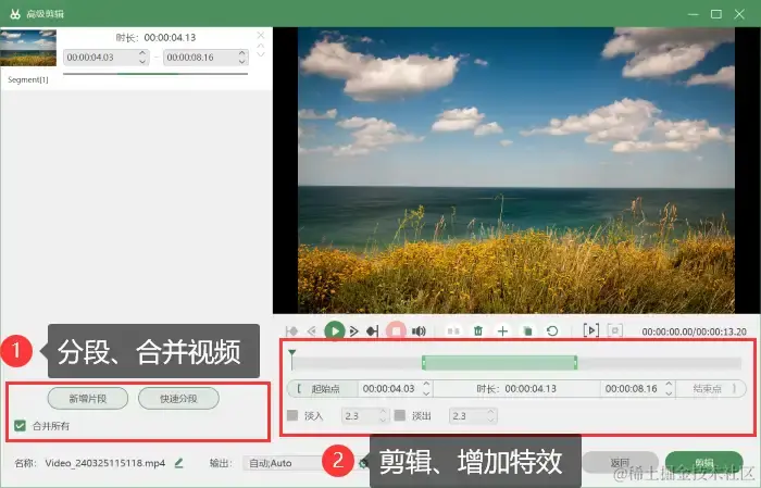步骤4:录制完成的视频,您可以进入 【高级剪辑】 页面对视频进行分段、剪辑等编辑。也可以在 【历史记录】 页面对您的视频使用媒体工具,可以进行压缩、合并、转换等操作。让您录制的视频更有趣更精彩。