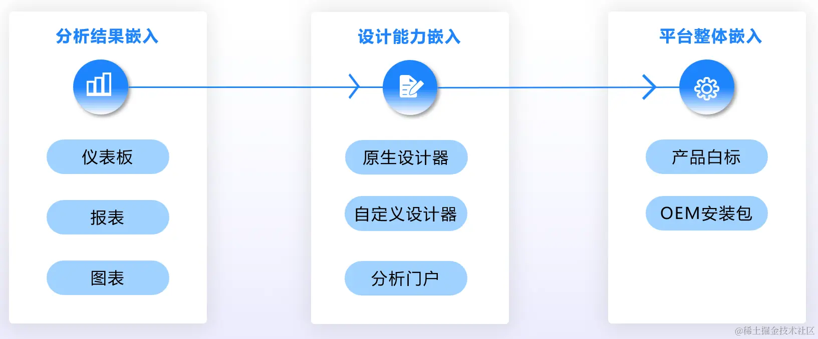 - **嵌入式分析简化用户操作:**AI 驱动的自然语言查询和用户界面优化,使非技术人员也能轻松使用BI工具,将BI嵌入到自己的应用中,从而提高用户体验和自主性。