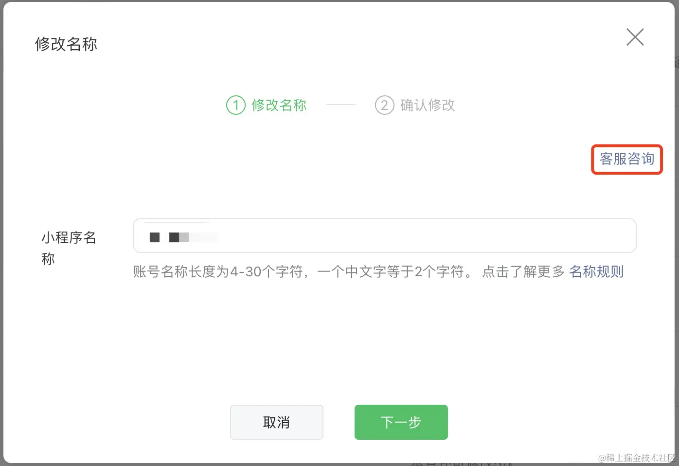 我搜了微信小程序的客服联系电话,有结果但是当时刚好已经是下班的时间,过了咨询时间了,于是我又想要不我把名称改为繁体字,这样也是一个意思,看能不能通过。接着我就到小程序的设置里先尝试修改名称,然后我就看到了一个客服咨询的入口: