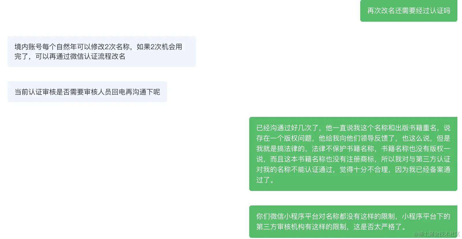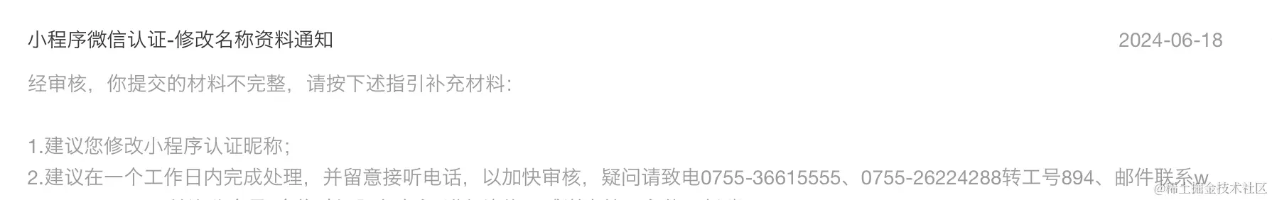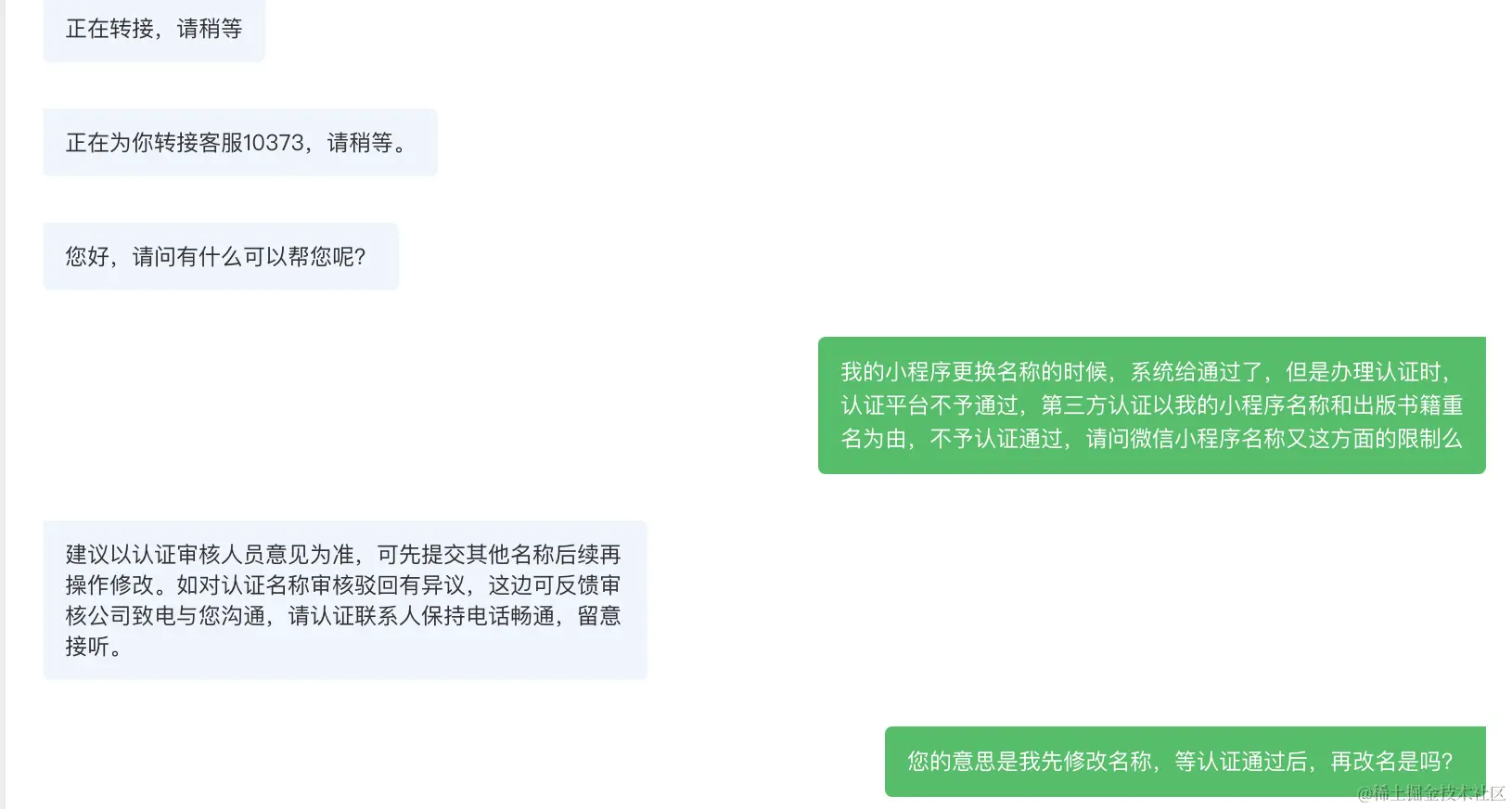 我是在上个月 6.18 上午提交的认证,下午我就收到了第三方审核员的电话,她说我认证的这个名称和一个出版的书籍重名了,存在一个版权的问题,需要修改一下才行,当时我就不能理解了,我心想微信小程序什么时候有这个规定了,难道小程序名称真的不能和出版书籍同名吗?所以我就同意了她给我打回了申请重新修改小程序的名字,这里有个点,每次认证是有 3 次驳回修改的机会的,修改后提交是不需要再次缴费的。