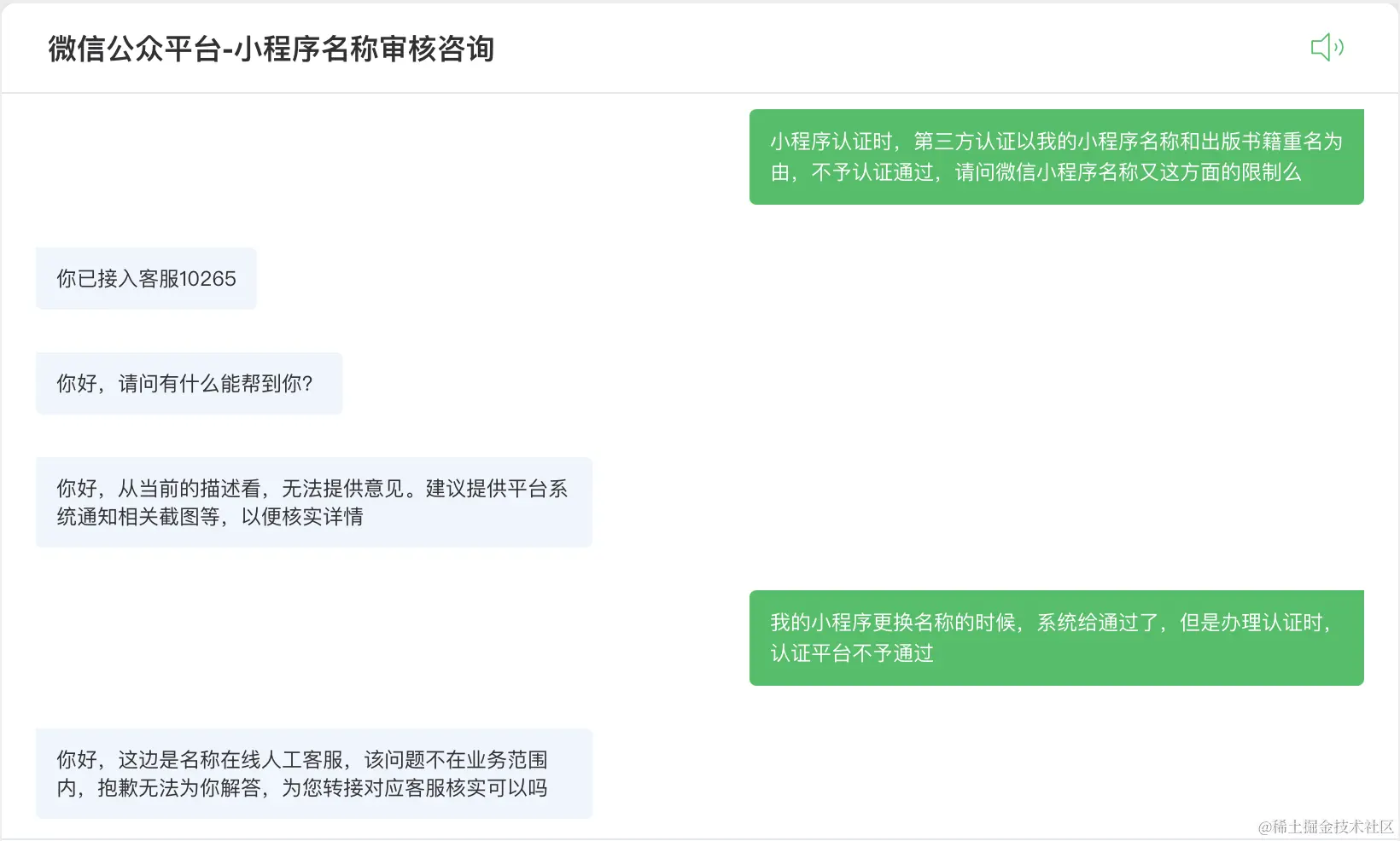 那个审核员说领导还是不同意,说微信那边的要求是微信那边的,他们这边的规定就是不行,会存在一个版权问题,我真的是有点不耐烦了,我再次跟他说了我不侵犯版权,但她的意思就是说得改名称才行,只要改个字就行,我就说改了字那还是一个意思么,我为小程序设计的 logo 就是这个名称,如果改名称 logo 就要重做,而且我的公众号也是这个名字,这就让我更不想改了。我就直接跟她说,我名称改不了。最后我说我向微信小程序官方咨询下,如果他们那边也确实不同意,那我就改。