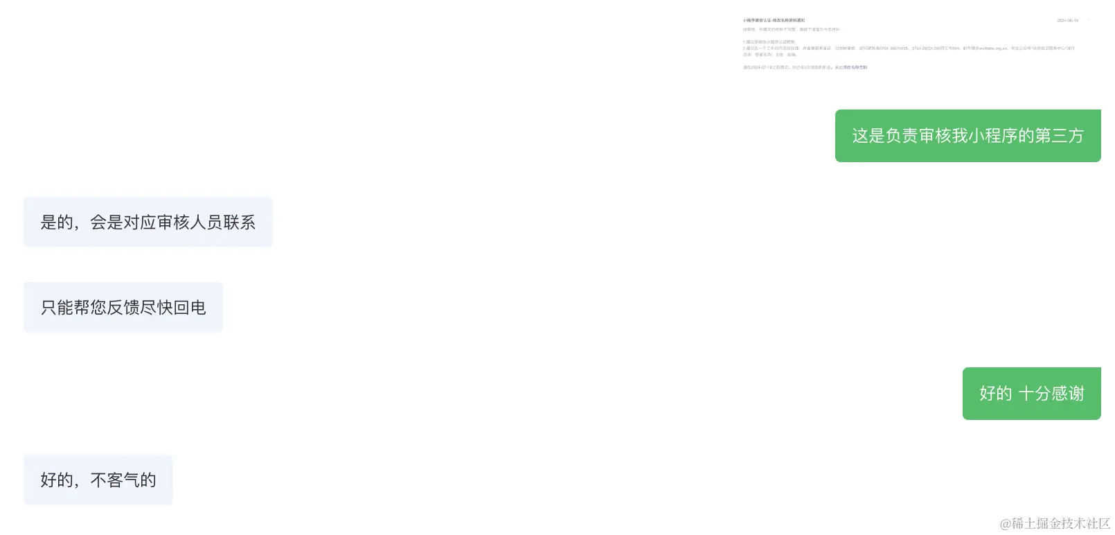 虽然我也不清楚微信那边怎么通知第三方的,但是办事的效率的确很高,这里要给微信点个赞,出乎我的意料,我刚刚反馈完,消息就下达到第三方审核机构,有他们领导层面到审核员,关节一下就打通了。