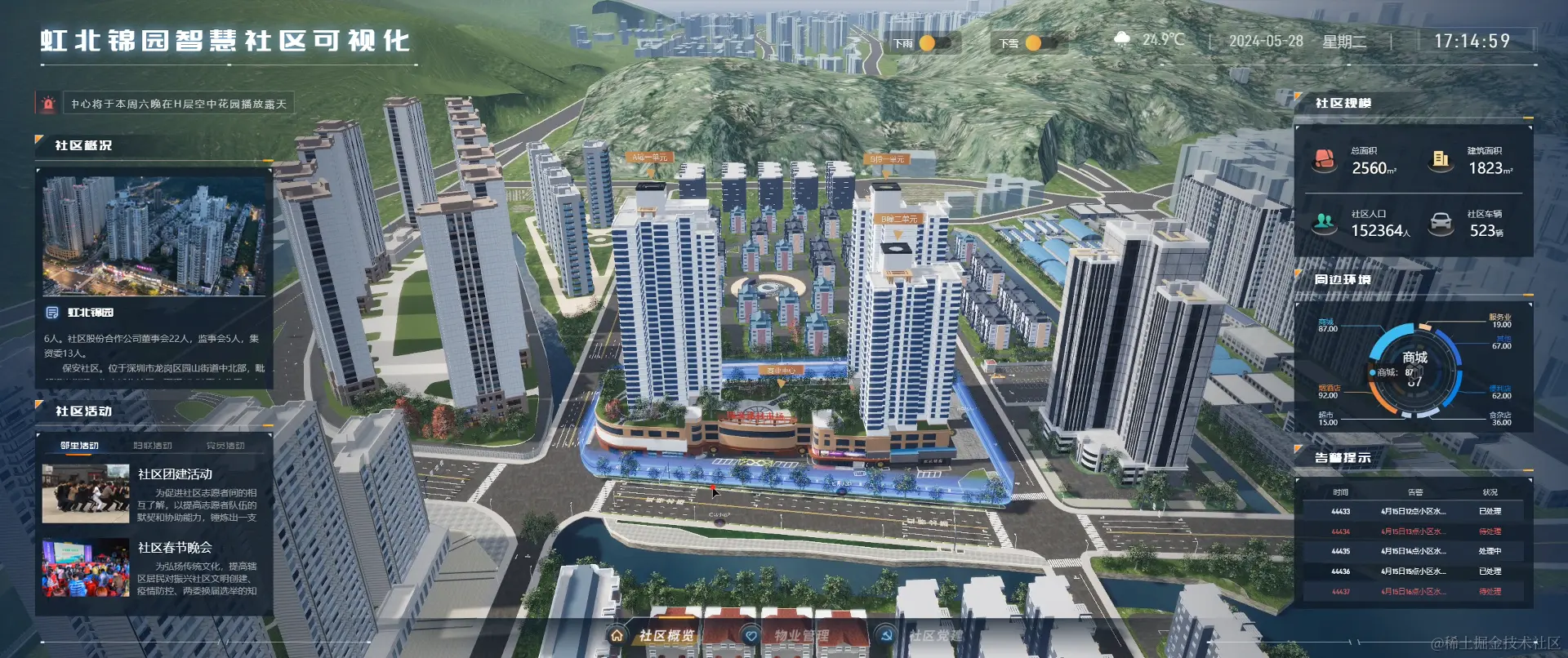 大屏页面采用模块化布局方式,将不同的数据展示区域划分为独立的模块,如社区概览模块、物业管理模块等,使得信息展示更加有序和清晰。主视觉中心通过三维空间的光影变换,能够实现数字空间与物理空间的时间映射,更加直观的反应出数据的时间和空间属性。