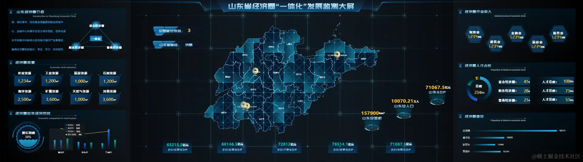 大屏页面以蓝色为主色调,绿色和黄色为辅色调,打造了一个科技风格的界面,同时加入了山东省地区地图,使画面感更加丰富。同时运用多种可视化组件,将数据以直观、易懂的方式呈现,全面展示了山东省经济圈的资源、行业发展、人才占比等海量数据信息。