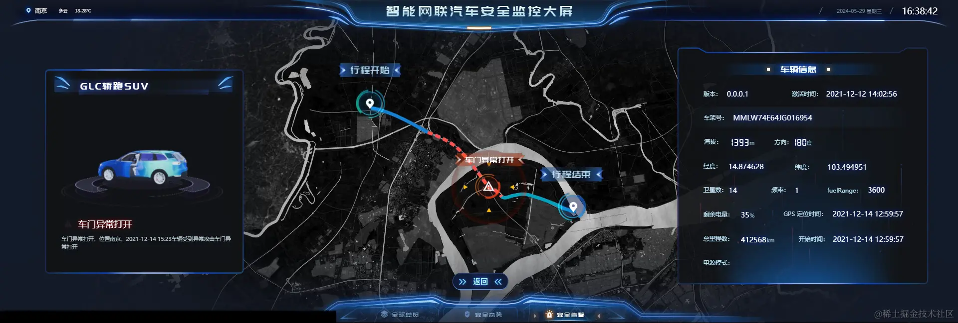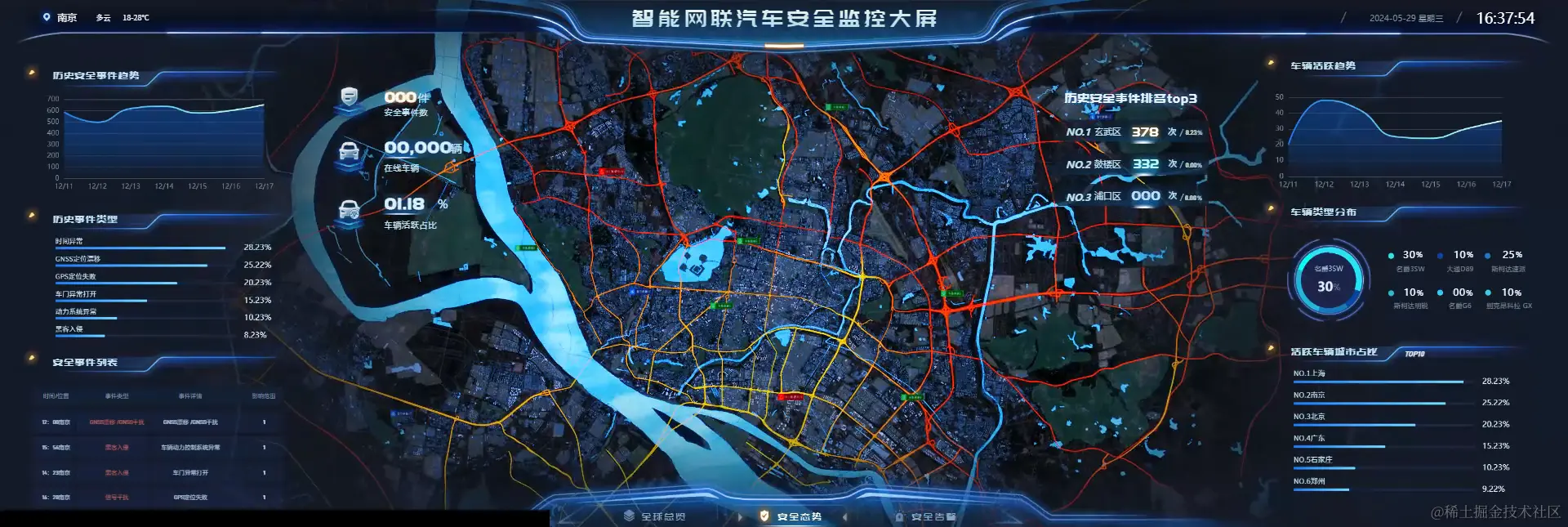 页面使用多种可视化图表,加以中心主视觉的三维地图,以及动态模拟等多种可视化手段,采用模块化布局的方式,将不同的数据展示区域划分为独立的模块,接入来自智能网联汽车的多种数据源,包括车辆状态、行驶轨迹、故障信息等,为管理者提供及时、准确的安全监控信息。
