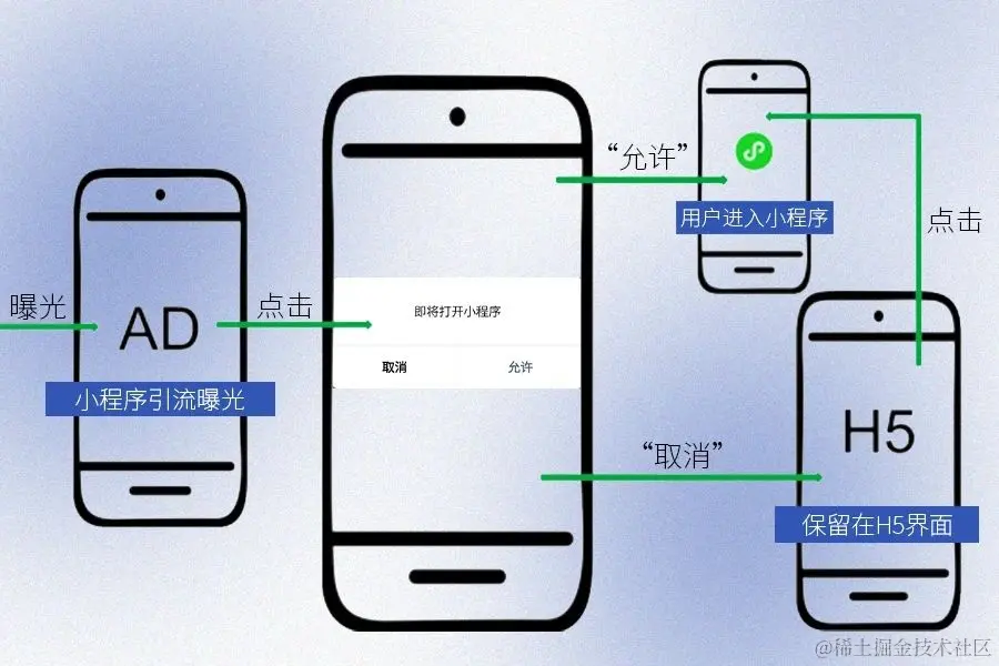 点击广告进入落地页的用户将会收到一条跳转提示——“即将打开XX小程序”。若用户选择“允许”,则直接进入该小程序;若选择“取消”,则用户的手机页面停留在有小程序入口的H5中,再一次引导用户进入小程序。