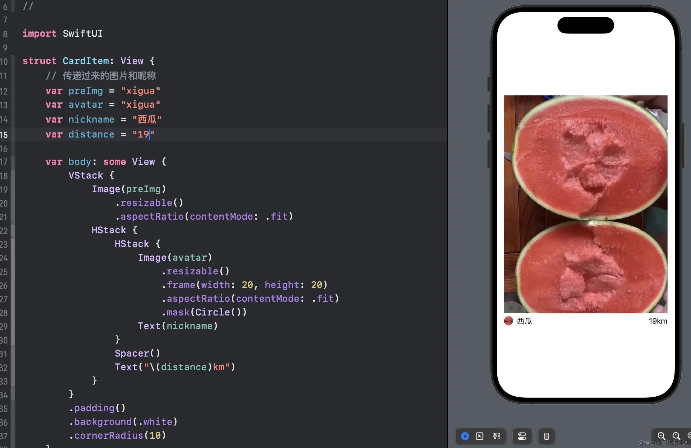 CardItem(preImg: "xigua", avatar: "xigua", nickname: "putao", distance: "11")