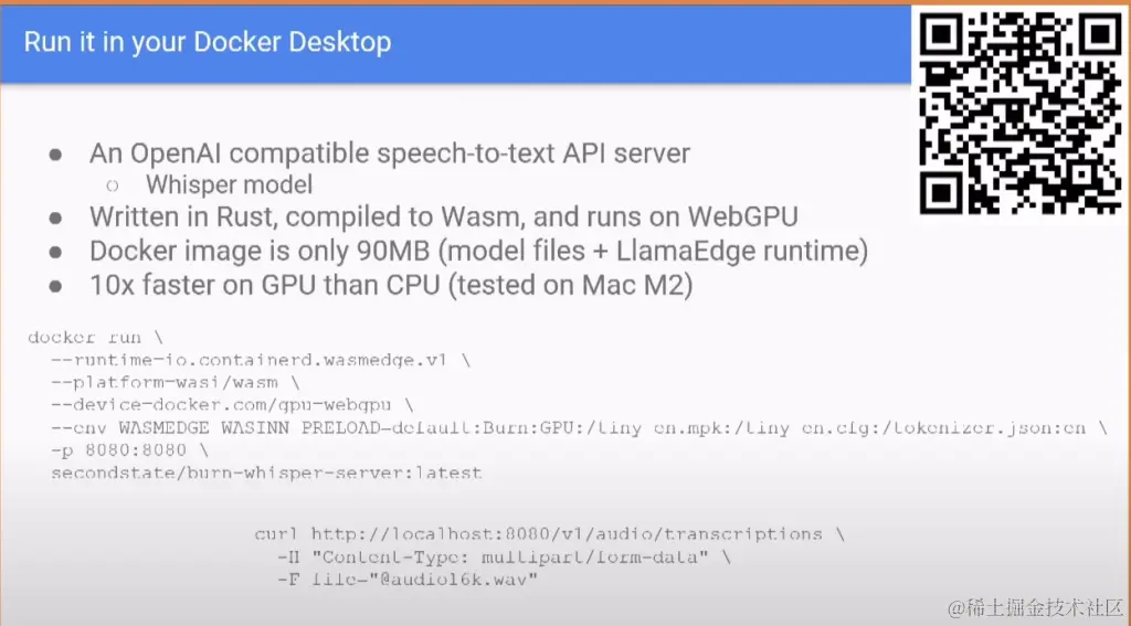 Yuan 说,这种设计确保任何应用程序,无论是 Python 应用程序、Rust 应用程序还是其他应用程序,都可以与 Docker 镜像中包含的 WebAssembly API 交互。运行此应用程序提供了一个与 OpenAI 兼容的语音到文本 API 服务器,允许上传语音文档,例如 WAV 文件。目前,只支持 WAV 文件,因为 MP3 支持尚未配置,”Yuan 说。