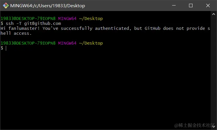 Title 为标题,任意填即可,将刚刚复制的 id_rsa.pub 内容粘贴进去,最后点击 Add SSH key。在 Git Bash 中检测 GitHub 公钥设置是否成功,输入如下命令: