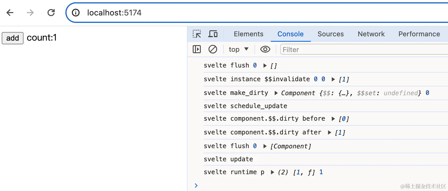 我们看到schedule_update内部其实就是把flush放到微任务中执行,所以我们会先看到component.$$.dirty在更新前的值是[0],然后执行位运算之后变成[1]。之后执行微任务中的flush,flush内部调用update,而update方法则是调用组件内的p方法。p方法中通过dirty & 1的判断1 & 1,从而执行set_data。