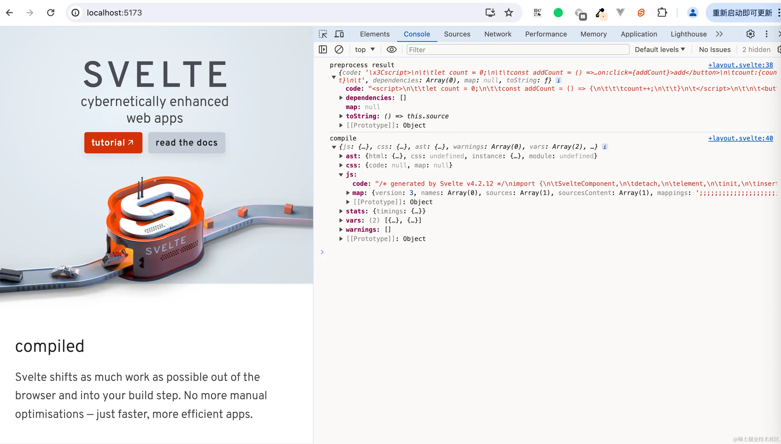 进入到网站目录cd sites/svelte.dev,执行pnpm run dev把网站跑起来,在控制台中查看打印结果: