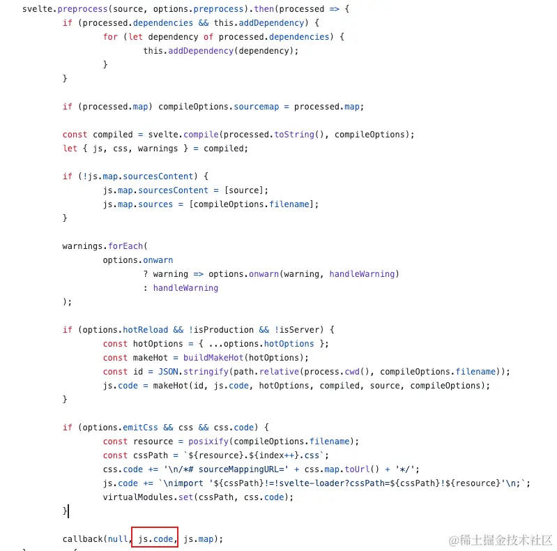 回看svelte-loader的代码,同样是返回js.code的代码。