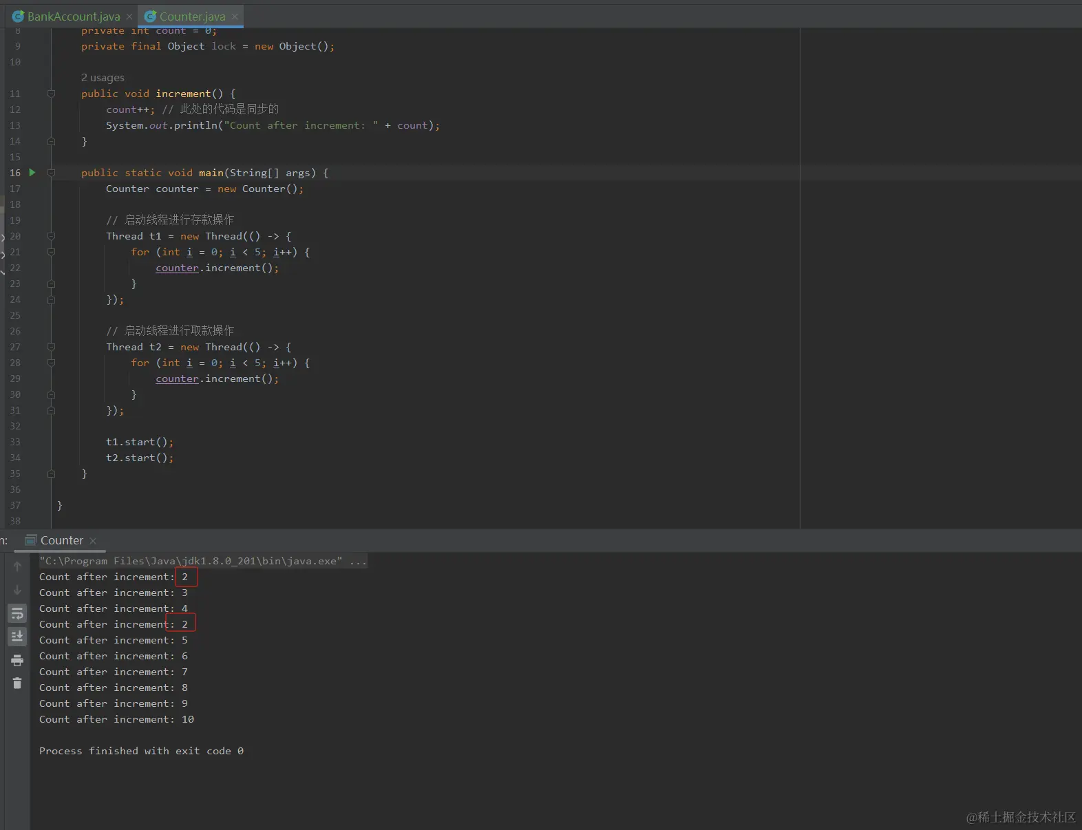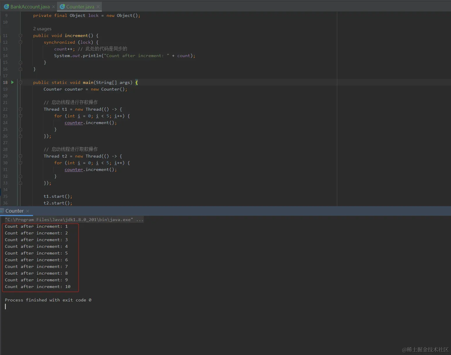在如下这个例子中,我们使用一个名为lock的私有final对象作为锁。increment方法中的代码块是同步的,只有获得lock的对象锁的线程才能执行这段代码。