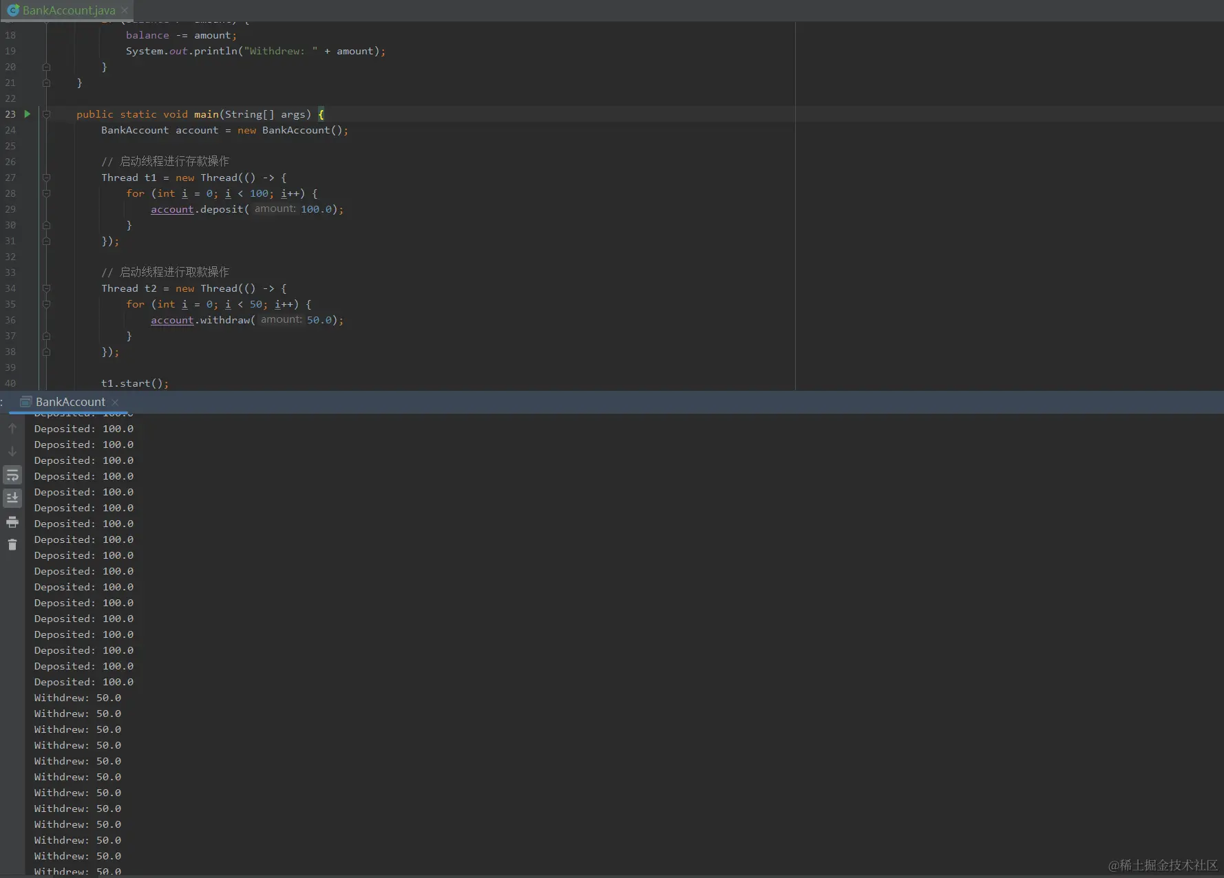 在上面的示例中,deposit和withdraw方法都是同步方法,它们保证了对balance字段的操作是原子性的,不会出现多个线程同时修改账户余额的情况。