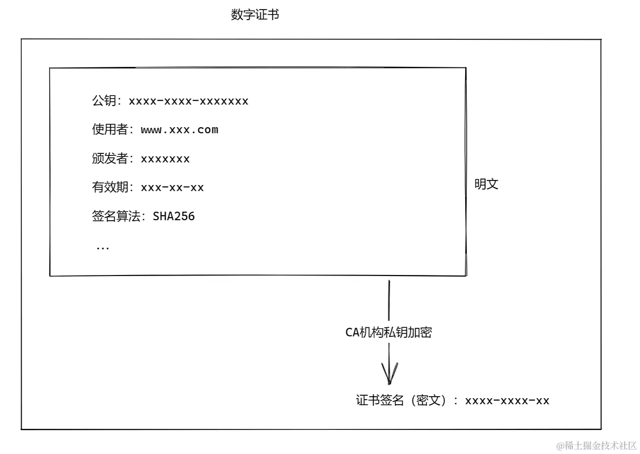 将上述信息提交给第三方机构,第三方机构使用自己的私钥对上图中的数据进行加密得到密文(签名),最后将密文和原始明文数据再次发生给申请者(即数字证书),如下图