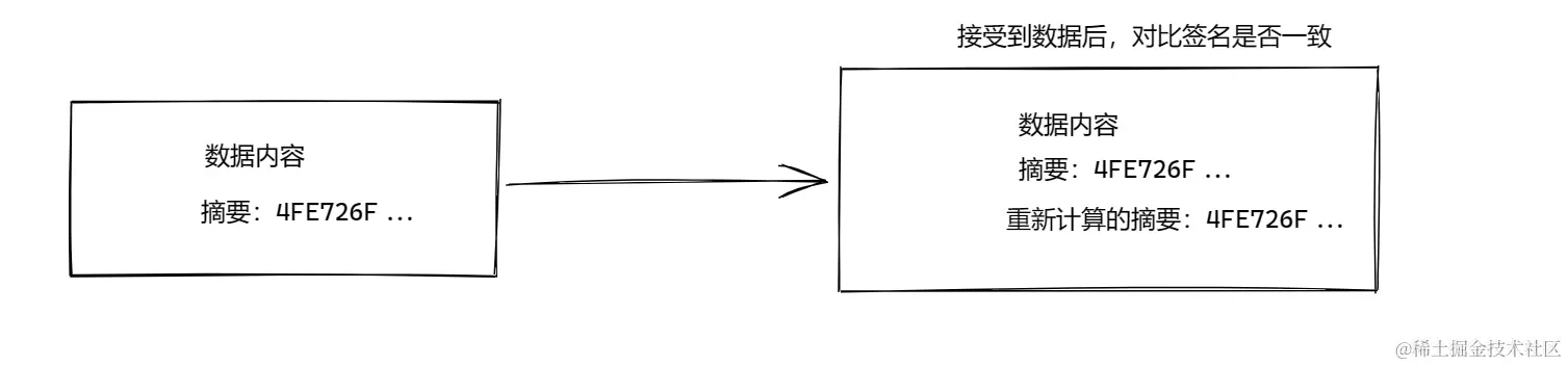 根据摘要算法以上的特性,其很适合用于校验信息是否被串改,在传输信息之前,通过摘要算法计算出信息的密文,信息的接收方接受到信息后,再次通过摘要算法计算信息的密文。相同,则代表信息没有被串改,如下图所示
