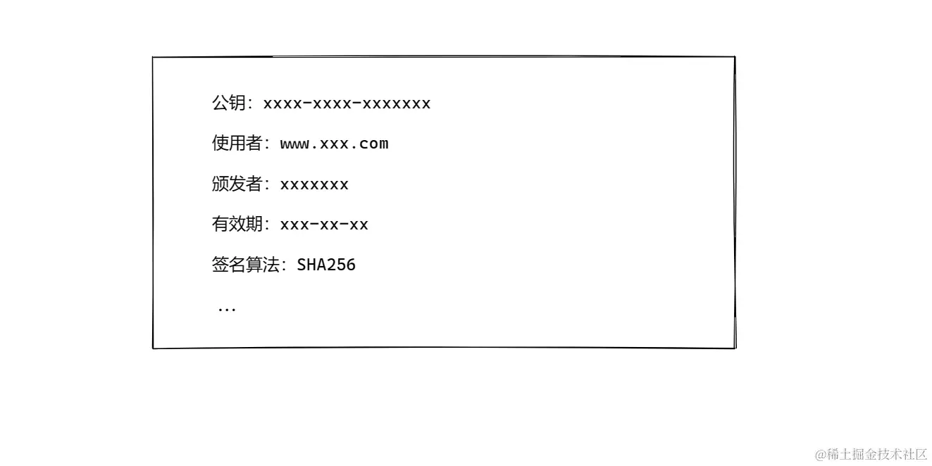 为了解决这个问题,引入了数字证书,数字证书由第三方机构颁发,首先证书的申请者将自己的信息(必须提供真实身份),包括公钥,使用者(一般为域名),颁发机构等,如下图