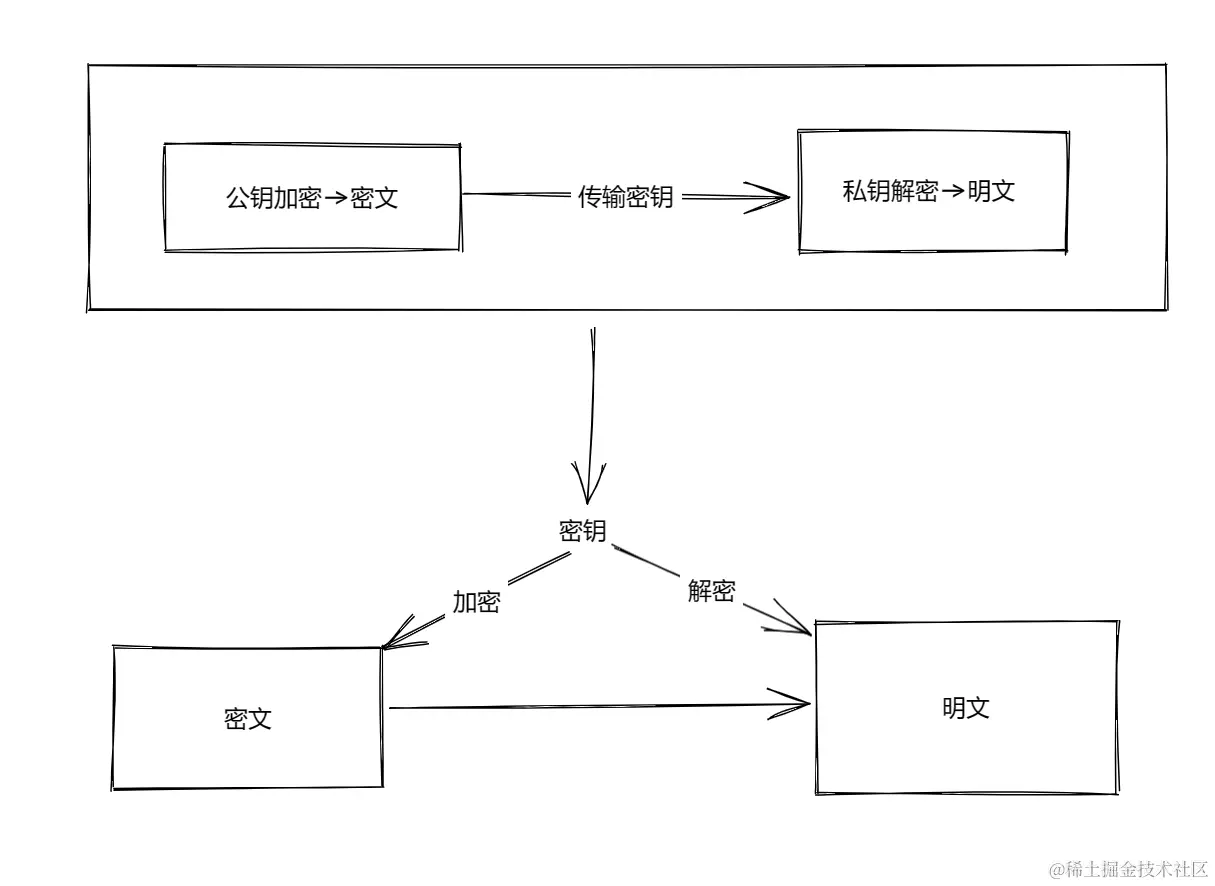 既想保证加密的安全性,又想提高加密效率,可以将二者结合使用,即:使用【非对称加密】加密【对称加密】的密钥,具体消息的加密,依然采用对称加密进行,如下图所示