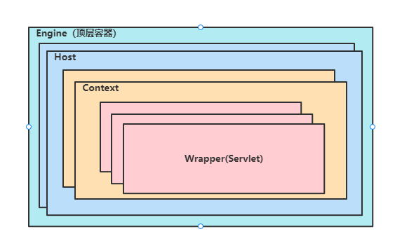 - Wrapper:表示一个 Servlet,最底层的容器,是对 Servlet 的封装,负责 Servlet 实例的创建、执行和销毁。