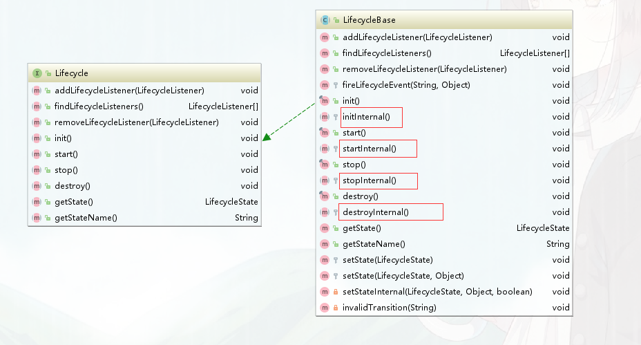 LifeCycleBase 实现了 LifeCycle 接口中所有的方法,还定义了相应的抽象方法交给具体子类去实现,这是典型的模板设计模式(骨架抽象类和模板方法)。