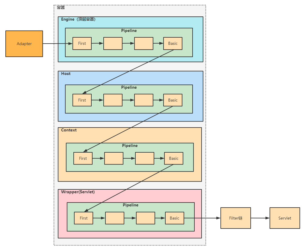 整个调用过程由连接器中的 Adapter 触发的,它会调用 Engine 的第一个 Valve: