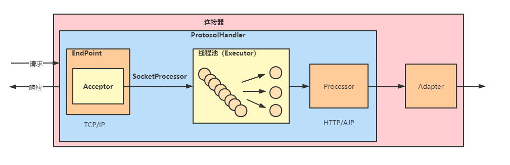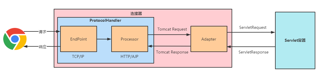 因此 Tomcat 的设计者设计了 3 个组件来实现这 3 个功能,分别是 EndPoint、Processor 和 Adapter: