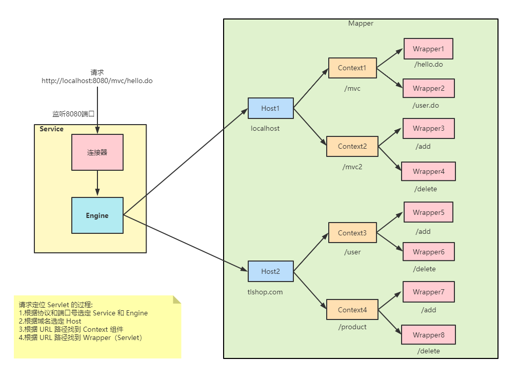 思考:Tomcat 是怎么确定请求是由哪个 Wrapper 容器里的 Servlet 来处理的呢?