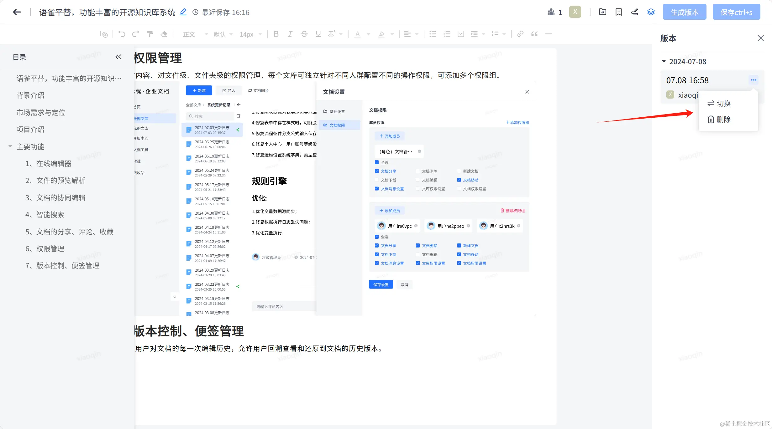 能记录用户对文档的每一次编辑历史,允许用户回溯查看和还原到文档的历史版本。
