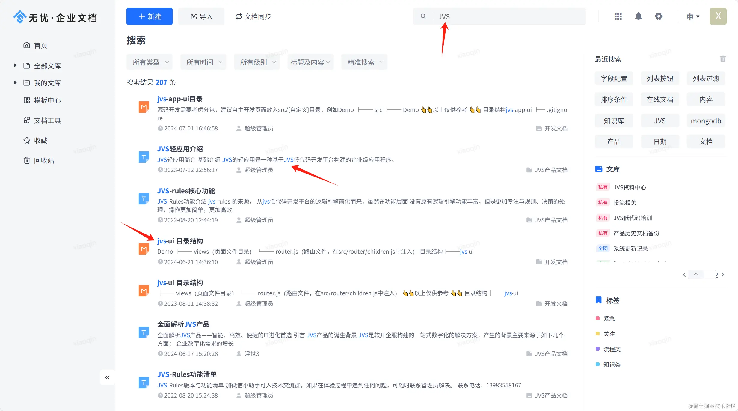 提供了基于内容、ocr的搜索,通过输入关键字迅速查找出需要的内容,关键字高亮展示。可自行筛选搜索维度(如文档类型、时间、文库级别、标题、内容、精准、模糊等)